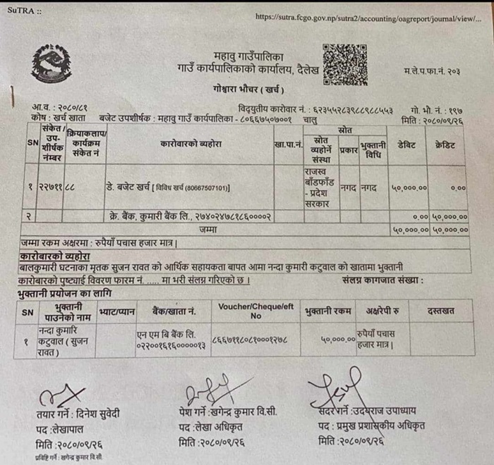 दैलेख। बालकुमारी घटनामा ज्यान गुमाएका सुजन रावतको परिवारलाई दैलेखको महाबु गाउँपालिकाले ५० हजार रुपैयाँ सहयोग गरेको छ।