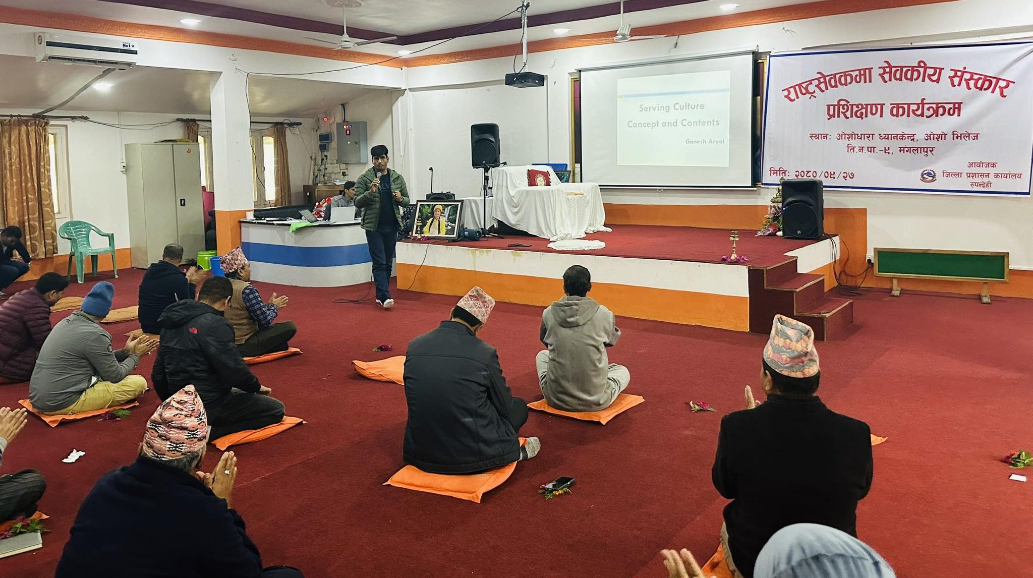 बुटवल । रुपन्देहीका राष्ट्रसेवकहरुलाई सेवकीय संस्कार सम्बन्धी प्रशिक्षण कार्यक्रम दिईएको छ । तिलोत्तमा नगरपालिका वडा न.९ स्थित मंगलपुरमा रहेको ओशोधरा ध्यानकेन्द्र,ओशो भिलेजमा जिल्ला प्रशासन कार्यालय रुपन्देहीले प्रशासन मातहात रहेका कार्यालयका कार्यालय प्रमुखहरुलाई सेवकीय संस्कार सम्बन्धी प्रशिक्षण दिईएको हो ।