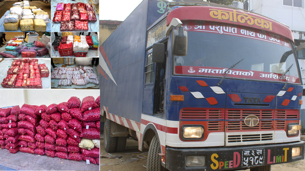 मकवानपुर थाहा नगरपालिका वडा नम्बर ४ का ४२ वर्षीय रामचन्द्र खत्रीले ना ३ ख ५१८९ नम्बरको कन्टेनर (ट्रक) मा लोड गरी लैजान लागेको अवस्थामा थानको कपडा १४ हजार ६३६ मिटर, लेडिज जुत्ता ३४० जोडी, नेट कपडा ५ हजार १०४ मिटर, दोसल्ला ४४२ पिस र साडी ६१२ पिस गरी ट्रकसहित कुल ३० लाख ६२ हजार २ सय ४० मूल्य बराबरको अवैध बस्तु बरामद गरेको जिल्ला प्रहरी कार्यालय रुपन्देहीका सूचना अधिकारी प्रहरी नायब उपरिक्षक मनोहर प्रसाद भट्टले जानकारी  दिए।