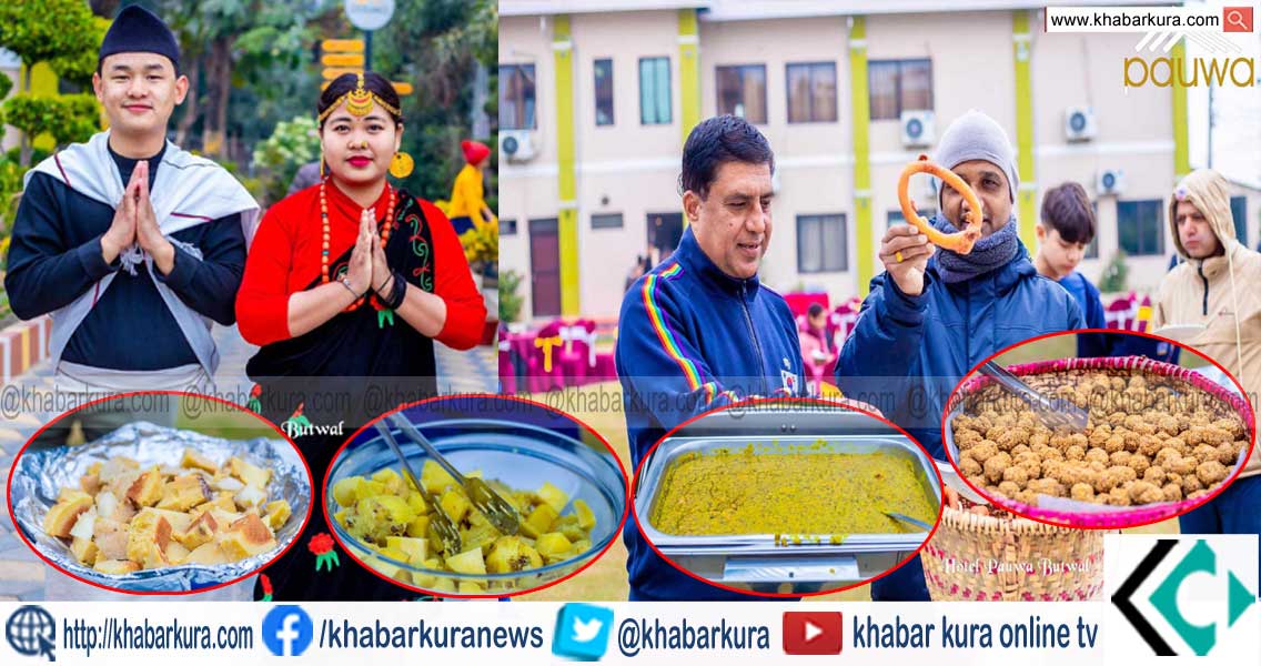 बुटवल । नेपाली परम्परा र चाडपर्वलाई बार्षिक क्यालेण्डर नै बनाएर हस्पिटालिटी प्रदान गर्दै आएको होटल पौवाले यस वर्ष पनि आफनो ग्राहकलाई लक्षित गरि माघीका परिकारहरु खवाएर माघी उत्सव मनाएको छ । “चिसो चिसो माघमा पौवाको ताप, माघीको खिचडी तपाई हाम्रो साथ !!” भन्ने मुल नाराका साथ सोमबार माघे संक्रान्तिको अवसर पारेर आफ्ना देशभरका १२ वटै शाखाबाट ग्राहकहरुलाई माघीको परिकार खुवाउँदै माघी उत्सव मनाएको हो ।