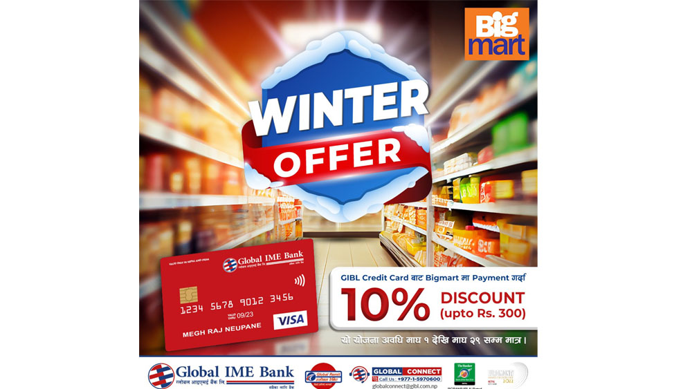 जाडो मौसमलाई लक्षित गरी ल्याइएको यस बिगमार्ट विन्टर अफरमा ग्लोबल आइएमई बैंकको क्रेडिट कार्डबाट भुक्तानी गर्दा छुटसँगै बिगमार्टद्वारा घोषणा गरिएका आकर्षक पुरस्कारहरु प्रदान गरिनेछ । यो अफर हाल बिगमार्टको ८१ वटा भन्दा बढी स्टोरहरुमा उपलब्ध रहेको छ ।