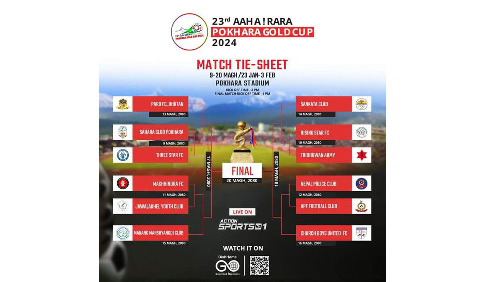 साविक विजेता संकटा क्लब, भुटानको पारो फुटबल क्लब, मनाङ मस्र्याङ्दी क्लब र लिग विजेता चर्च ब्वाइज युनाइटेड क्लबले भने सिधै क्वार्टरफाइनलमा प्रवेश पाएका छन् । प्रतियोगिताको फाइनल खेल माघ २० गते हुनेछ ।