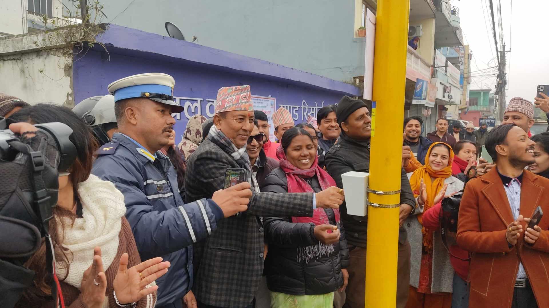ुजडान भएको ‘पेलिकन क्रसिङ’ मा पैदलयात्रुले स्वीच थिचेको ३ मिनेटमा ट्राफिक बत्तीमा रातो बल्छ, गाडी रोकिन्छन् अनि पारीपट्टी यात्रुलाई बाटो काट्ने हरियो मानिसको सिग्नल आएपछि यात्रुले बाटो पार गर्छन् । त्यसको केहीबेरमा हाइवेमा हरियो बत्ती बल्छ अनि गाडी अगाडि बढ्छ,’ प्रहरी निरिक्षक बिस्टले भने ।