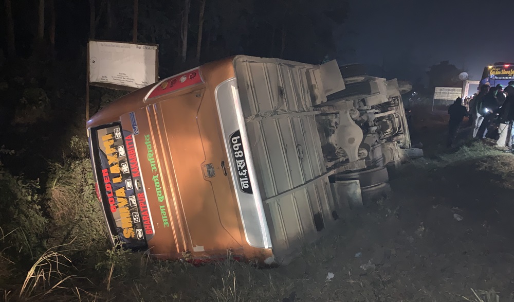 काकडभिट्टाबाट भरतपुर हिँडेको ना६ख ४११ नम्बरको बस दुर्घटना हुँदा १३ यात्रु घाइते भएका हुन्।
