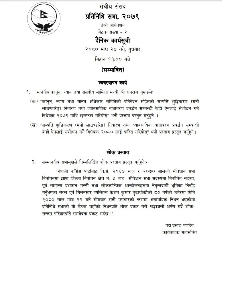 संसद् सचिवालयका कार्यवाहाक महासचिव पद्म प्रसाद पाण्डेयले सार्बजनिक गरेको सम्भावित कार्यसुची अनुसार आजको बैठकमा सम्पत्ति शुद्धीकरण मनी लाउन्डरिङ्ं निवारण तथा व्यावसायिक वातावरण प्रवर्द्धन सम्बन्धी केही ऐनलाई संशोधन गर्ने विधेयक, २०७९ दफावार छलफलसहित पारित गरिनेछ ।