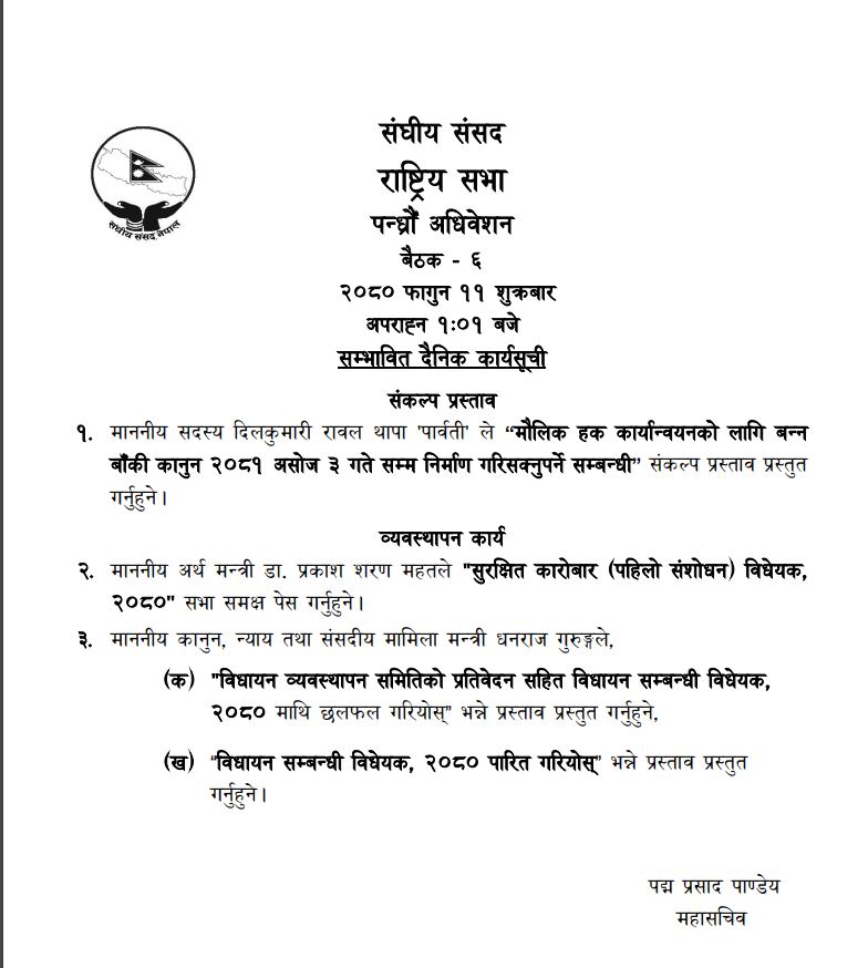 अर्थमन्त्री प्रकाशशरण महतले ‘सुरक्षित कारोबार (पहिलो संसोधन) विधेयक, २०८०’ सभा समक्ष पेश गर्नेछन भने भने कानुन न्याय तथा संसदीय मामिला मन्त्री धनराज गुरूङले विद्यायन ब्यवस्थापन समितिको प्रतिवेदनसहित विद्यायन सबन्धी विधेयक २०८० माथी छलफल गरियोस भन्ने प्रस्ताव प्रस्तुत गर्नेछन साथै सो विधेयक पारित गरियोस भन्ने प्रस्ताव पेश गर्ने महासचिव पदमप्रसाद पाण्डेयले जारी गरेको सम्भावित कार्यसुचीमा उल्लेख गरिएको छ ।