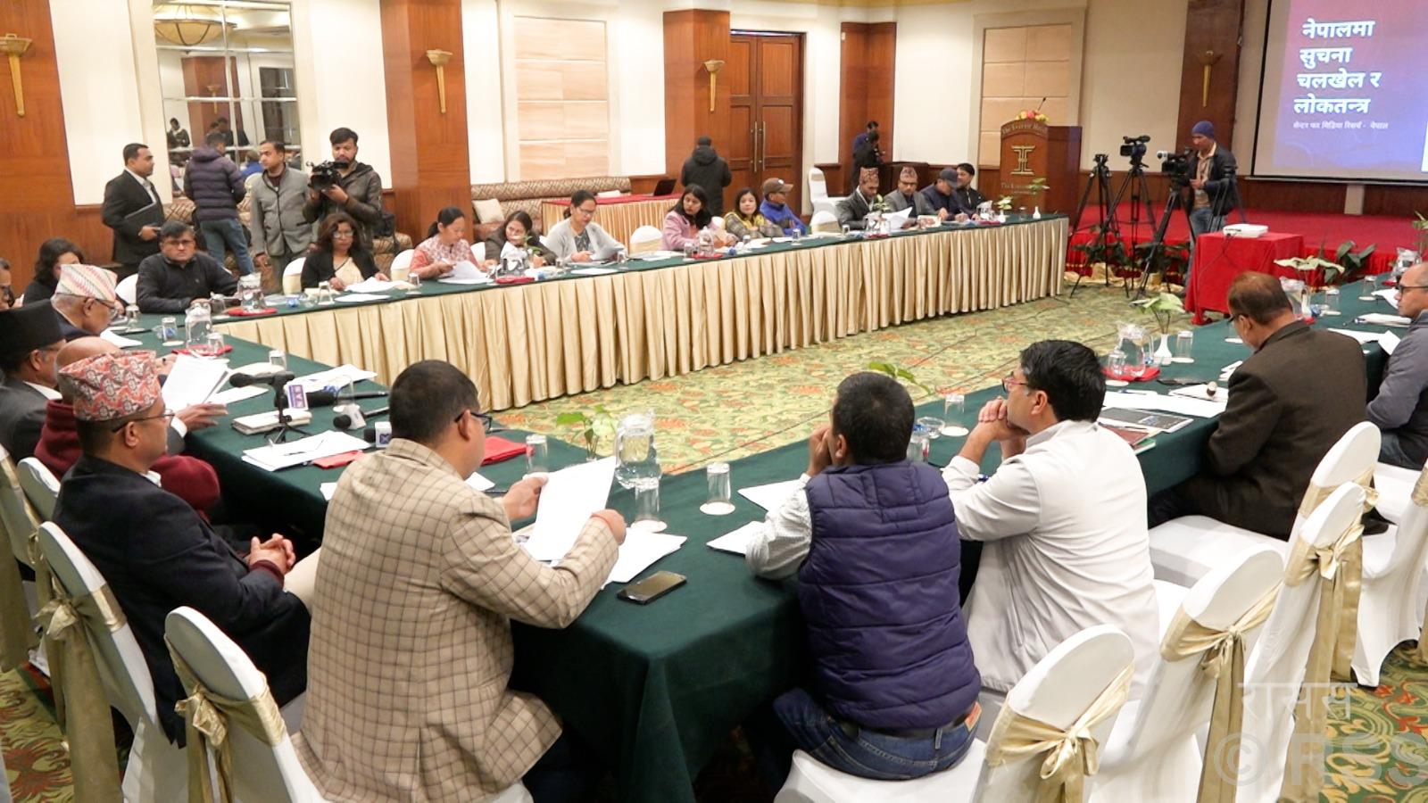 कार्यक्रममा ‘सूचना चलखेल नियन्त्रणमा राजनीतिक दलहरुको भूमिका’ विषयक कार्यपत्र प्रस्तुत गर्दै पूर्वप्रमुख निर्वाचन आयुक्त भोजराज पोखरेलले गलत सूचनाका माध्यमबाट लोकतन्त्र र लोकतान्त्रिक नेतृत्वविरुद्ध निरन्तर प्रहार हुन थालेको बताए । सूचनामा चलखेल नियन्त्रण गर्न राजनीतिक दलको महत्वपूर्ण भूमिका रहेको उल्लेख गर्दै उनले दलका कार्यकर्ता तथा शुभेच्छुकको ‘डिजिटल’ ज्ञान बढाउने तथा सामाजिक सञ्जाल सञ्चालनको आचारसंहिता जारी गरी सोहीअनुसार प्रयोग गर्न कार्यकर्ता र समर्थकलाई आग्रह गर्नुपर्ने बताए ।