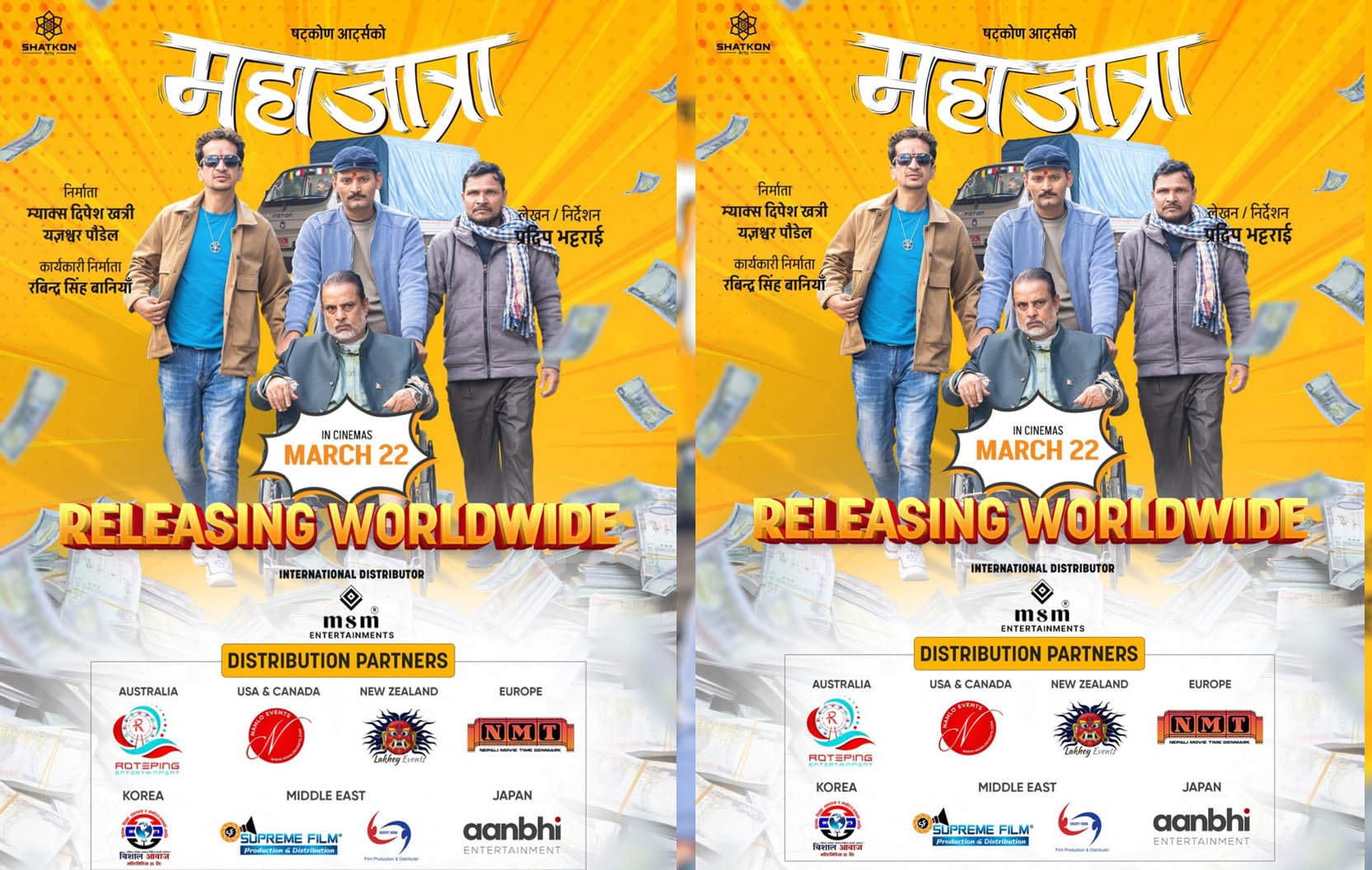 काठमाडौं । नेपाली फिल्म ‘महाजात्रा’ नेपालसहित विश्वभर एकसाथ प्रदर्शन हुने भएको छ । षट्कोण आर्टसले निर्माण गरेको ‘जात्रा’ शृङ्खलाको तेस्रो भाग ‘महाजात्रा’ नेपाल र भारत बाहेकको प्रदर्शन र वितरणको अधिकार खरिद गरेको एमएसएम इन्टरटेन्मेन्टस्ले प्रदर्शनका लागि वितरण गर्दै छ ।