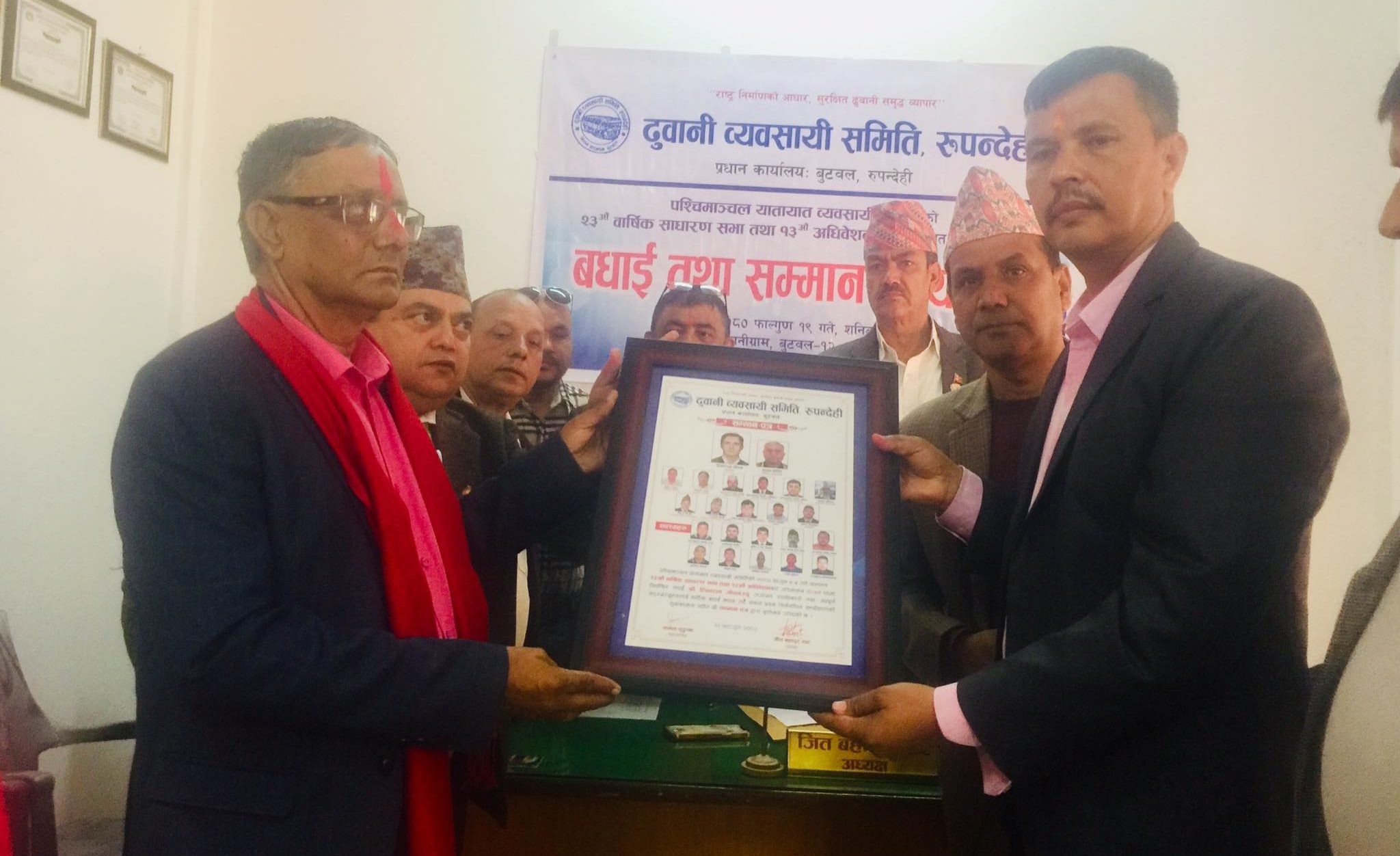 सो अवसरमा पश्चिमाञ्चल यातायाता व्यवसायी समितिका नवनिर्वचित अध्यक्षसहित पदाधिकारी तथा सदस्यहरुलाई ढुवानी व्यवसायी समिति, रुपन्देहीका अध्यक्ष जीत बहादुर भाटले टिका तथा खादा लगाएर सम्मान गरेका थिए ।