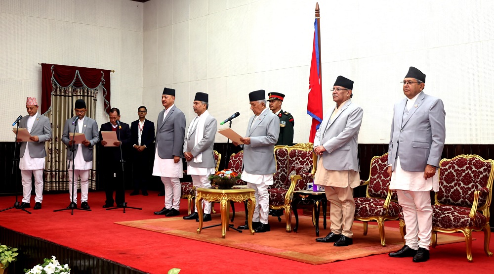 काठमाडौं । नयाँ सत्ता समीकरण बनेपछि नियुक्त गरिएका नयाँ मन्त्रीहरुको सपथ ग्रहण भएको छ ।
