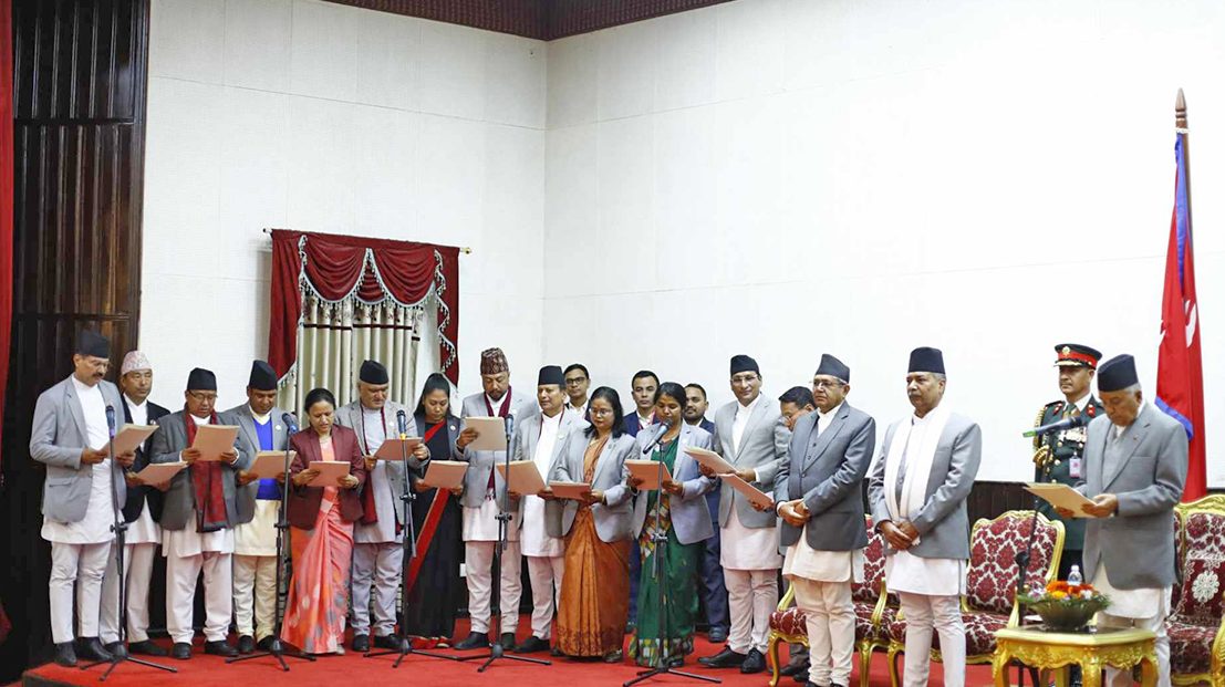 काठमाडौं । प्रधानमन्त्री पुष्पकमल दाहाल ‘प्रचण्ड’ नेतृत्वको मन्त्रिपरिषद्मा नयाँ नियुक्ति पाएका मन्त्रीहरूले शपथ लिएका छन् । राष्ट्रपति भवन सितल निवासमा आयोजित शपथ ग्रहण समारोहमा राष्ट्रपति रामचन्द्र पौडेलले नवनियुक्त मन्त्रीहरूलाई पद तथा गोपनीयताको शपथ गराएका हुन् ।