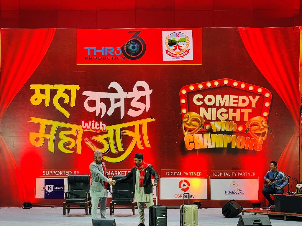 बुटवल । बुटवलको अन्तर्राष्ट्रिय सम्मेलन केन्द्रमा बुधबार साँझ ‘महाकमेडी विथ महाजात्रा’ कार्यक्रम सम्पन्न भयो । चलचित्र ‘महाजात्रा’ र ‘कमेडी नाइट विथ च्याम्यिन’ मिलेर देशदौडाहामा रहेको टोलीले पोखरापछि बुटवलमा ‘महाकमेडी विथ महाजात्रा’ सम्पन्न गरेको हो ।