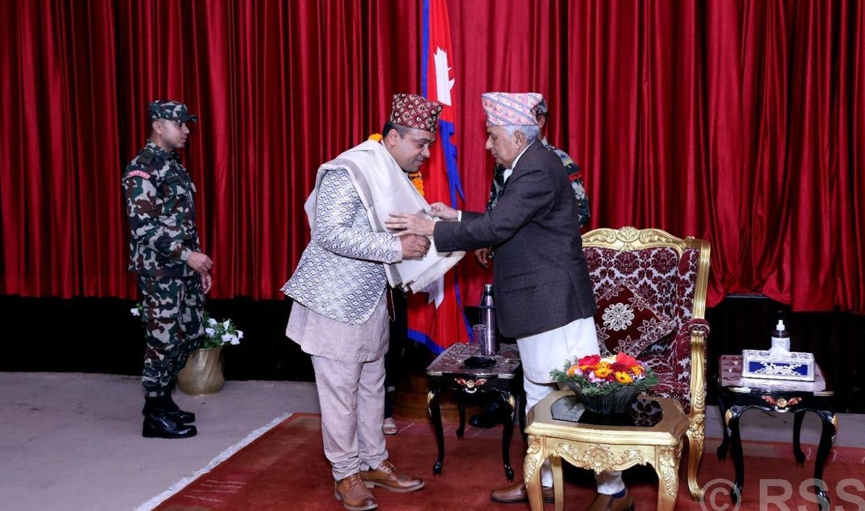काठमाडौं । राष्ट्रपति रामचन्द्र पौडेलले सर्वाधिक उचाइमा म्यूजिक भिडियो निर्माण गरी विश्वकीर्तिमान कायम गर्ने राजेन्द्र लुइँटेललाई सम्मान गरेका छन् । राष्ट्रपति कार्यालय शितल निवासमा राष्ट्रपति पौडेलले लुइँटेल र उनको टिमलाई बधाईसहित माला र दोसल्ला ओढाएर सम्मान गरे ।