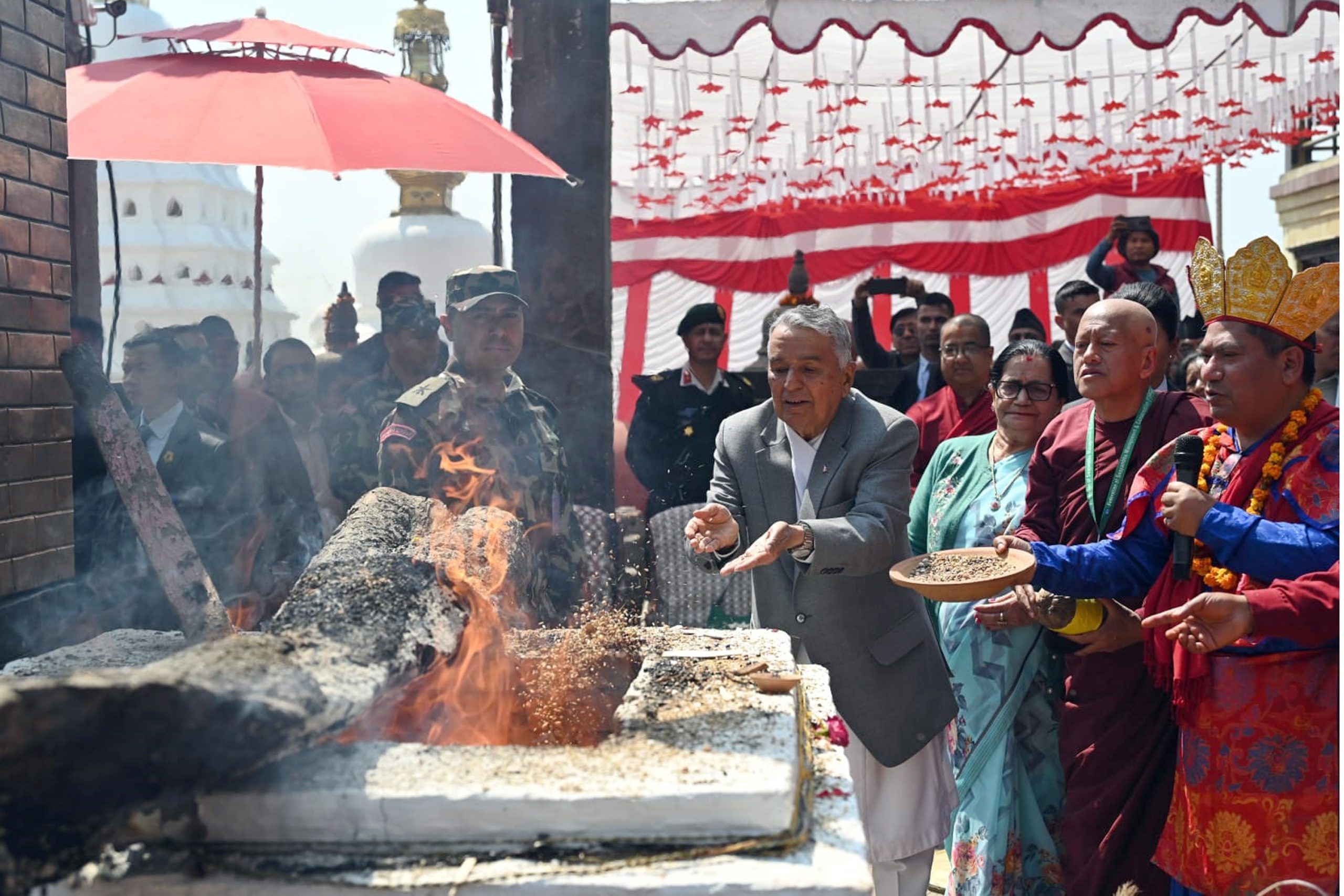काठमाडौं । राष्ट्रपति रामचन्द्र पौडेलले स्वयम्भू महाचैत्यको मूल छत्र-गजुरको प्राण प्रतिष्ठा गरेका छन । स्वयम्भू व्यवस्थापन तथा संरक्षण महासमितिद्वारा आज आयोजित कार्यक्रममा धार्मिक परम्पराअनुसार राष्ट्रपति पौडेलले चैत्यको पूजा गरेका हुन ।