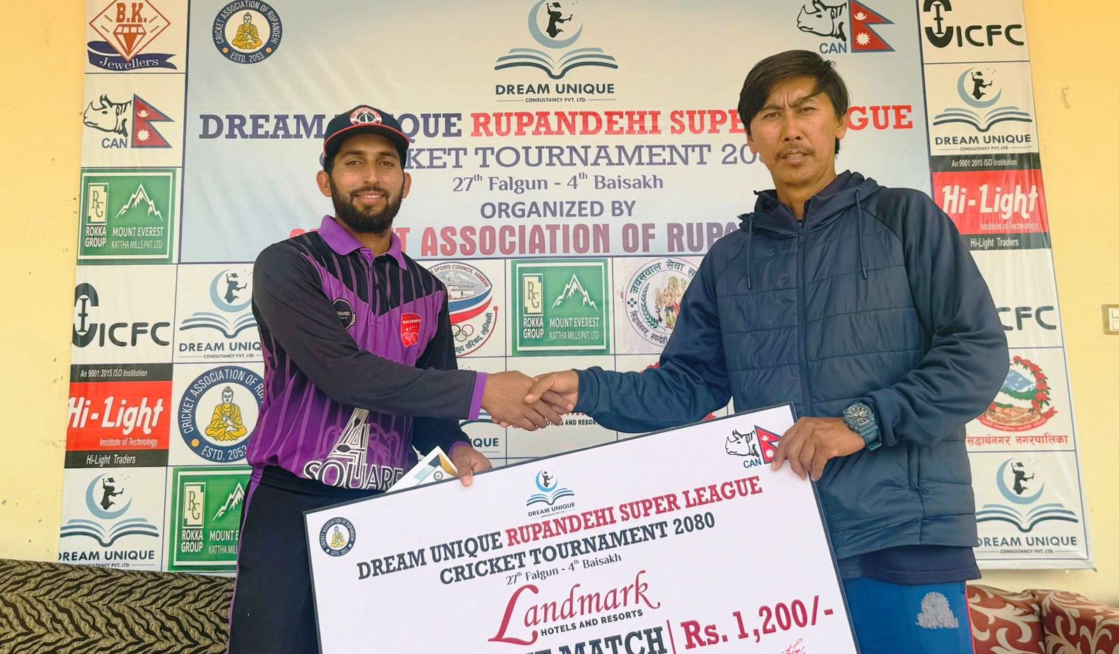 रुपन्देही क्रिकेट संघको आयोजना तथा ड्रिम युनिक कन्सलटेन्सी प्रालि, बुटवलको मुख्य प्रायोजनामा जारी प्रतियोगिताको विजेता टिमले १ लाख १ हजार र उपविजेताले ५० हजार १ रुपैयाँसहित ट्रफी, मेडल र प्रमाणपत्र पाउनेछन् । म्यान अफ द सिरिजलाई १५ हजार, बेष्ट ब्याटर, बेष्ट बलर र उदयीमान खेलाडीलाई जनही ५ हजारसहित ट्रफी र प्रमाणपत्र प्रदान गरिनेछ । यस्तै प्रत्येक खेलको म्यान अफ द म्याचलाई १ हजार २ सय रुपैयाँ दिइनेछ । आगामी वैशाख ४ गतेसम्म सञ्चालन हुने प्रतियोगितामा जिल्लाका ‘ए’ र ‘बी’ डिभिजनका २० टीमको सहभागिता रहेको संघका सदस्यसमेत रहेका प्रतियोगिता संयोजक प्रथम पराजुलीले जानकारी दिए ।