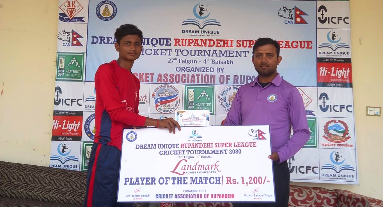 रुपन्देही क्रिकेट संघको आयोजना तथा ड्रिम युनिक कन्सलटेन्सी प्रालि, बुटवलको मुख्य प्रायोजनामा जारी प्रतियोगिताको विजेता टिमले १ लाख १ हजार र उपविजेताले ५० हजार १ रुपैयाँसहित ट्रफी, मेडल र प्रमाणपत्र पाउनेछन् । म्यान अफ द सिरिजलाई १५ हजार, बेष्ट ब्याटर, बेष्ट बलर र उदयीमान खेलाडीलाई जनही ५ हजारसहित ट्रफी र प्रमाणपत्र प्रदान गरिनेछ । यस्तै प्रत्येक खेलको म्यान अफ द म्याचलाई १ हजार २ सय रुपैयाँ दिइनेछ । आगामी वैशाख ४ गतेसम्म सञ्चालन हुने प्रतियोगितामा जिल्लाका ‘ए’ र ‘बी’ डिभिजनका २० टीमको सहभागिता रहेको संघका सदस्यसमेत रहेका प्रतियोगिता संयोजक प्रथम पराजुलीले जानकारी दिए ।