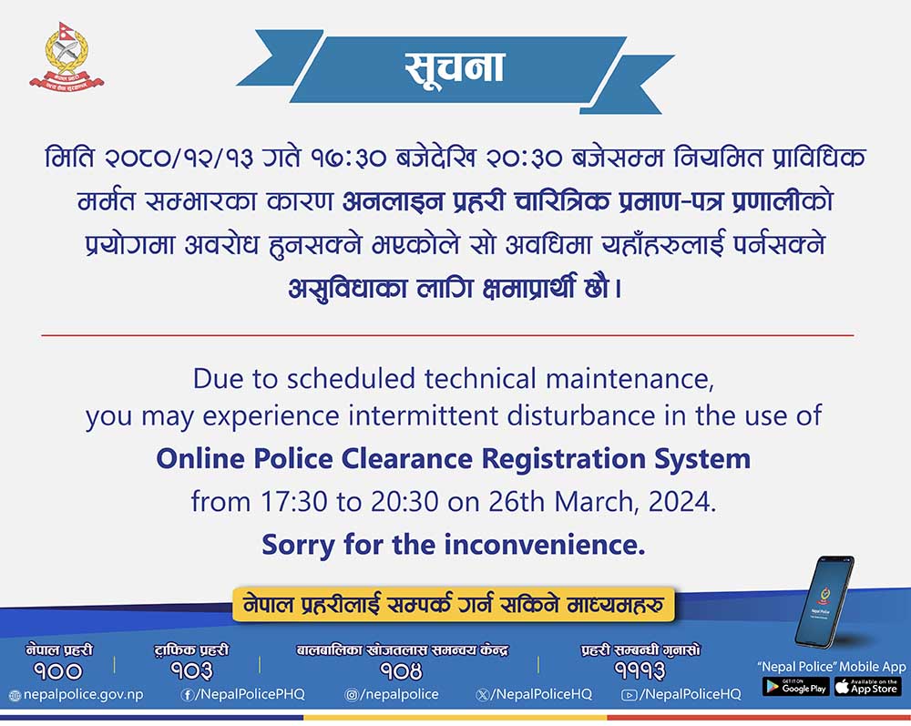 प्रहरी प्रधान कार्यालयका अनुसार आज साँझ साढे ५ बजेदेखि साढे ८ बजेसम्म प्राविधिक मर्मत सम्भारका कारण सेवा अवरुद्ध हुने भएको हो । प्रहरीले अनलाइनमा प्रहरी चारित्रिक प्रमाण पत्र दिदै आएको छ ।