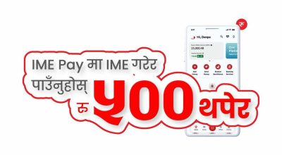 यहि चैत ६ देखि जेष्ठ मसान्त सम्म तिन महिनाको लागि चल्ने सो अफरका ३ जना भाग्यशाली विजेताको नाम आइएमई पे को सामाजिक सन्जालमा सार्वजनिक गरिने छ । यसमा पहिलो भाग्यशाली विजेताले आफ्नो हवाई टिकट खरिद गरेको रकमको १००५ क्यास ब्याक पाउनेछन् ।
