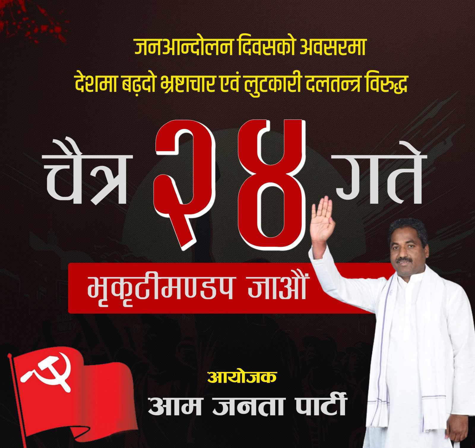 काठमाडौं । आम जनता पार्टी (आजपा) ले दलतन्त्र र भ्रष्टाचारको विरुद्धमा आज शनिबार काठमाडौंमा जनप्रदर्शन गर्दैछ ।