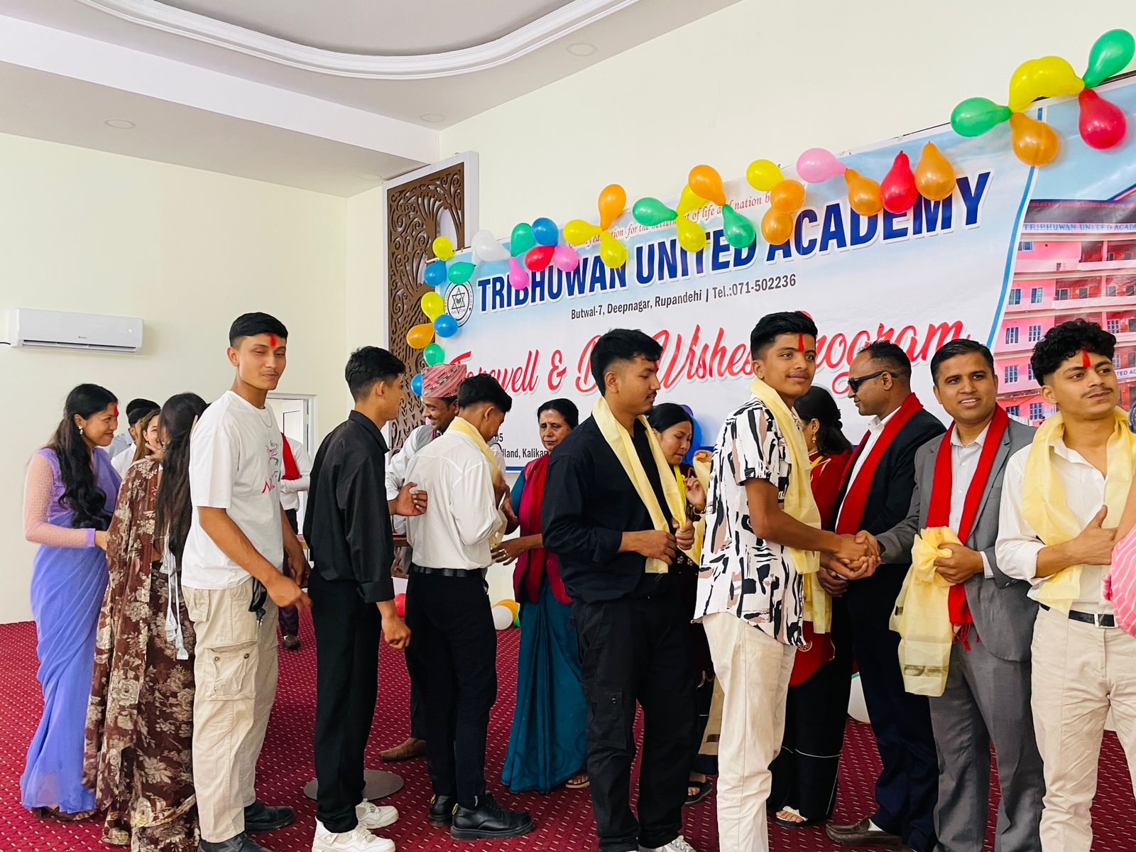 बुटवल । बुटवल-७ दीपनगरस्थित त्रिभुवन युनाइटेड एकेडेमीका कक्षा १२ मा अध्ययनरत विद्यार्थीहरुलाई आगामी शैक्षिक यात्राको सफलतासँगै बिदाई गरिएको छ । विद्यालयका कक्षा ११ मा अध्ययनरत विद्यार्थीहरुले बुधबार बृहत कार्यक्रम गरी कक्षा १२ का विद्यार्थीहरुलाई मायाको चिनो प्रदान गरी बिदाई गरेका हुन ।