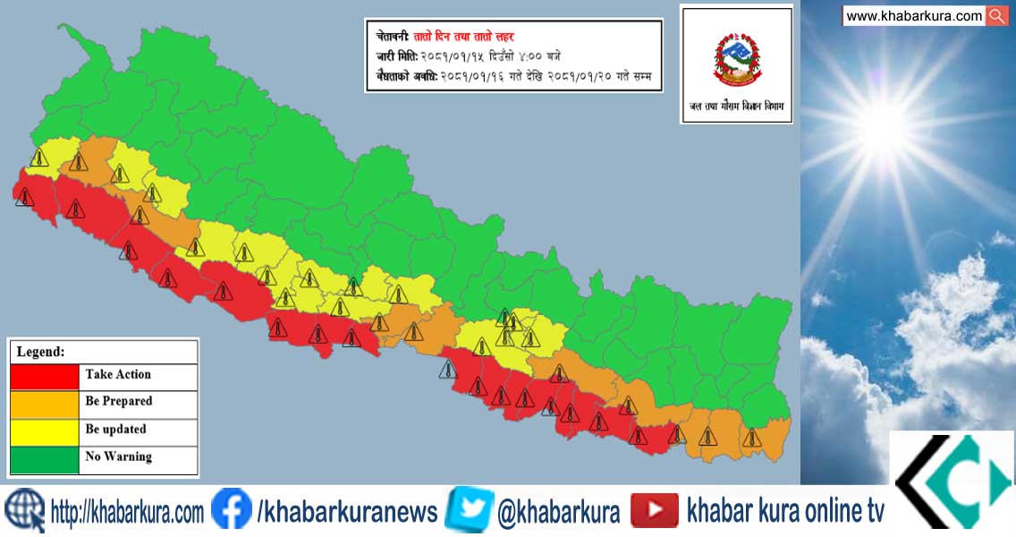 आगामी केही दिनसम्म देशभरको तापक्रमको अवस्थाको विश्लेषणअनुसार तराईका भू–भागमा अत्यधिक गर्मीको सम्भावना रहेको विभागले बुलेटिनमार्फत चेतावनीसहितको सूचना जारी गरेको छ ।
