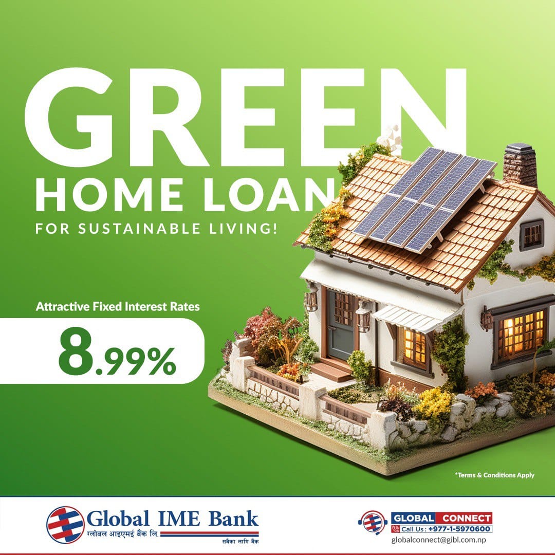 काठमाडौं । ग्लोबल आइएमई बैंक लिमिटेडले ८.९९ प्रतिशत स्थिर ब्याजदरमा ग्लोबल ग्रीन आवास कर्जा योजना ल्याएको छ ।