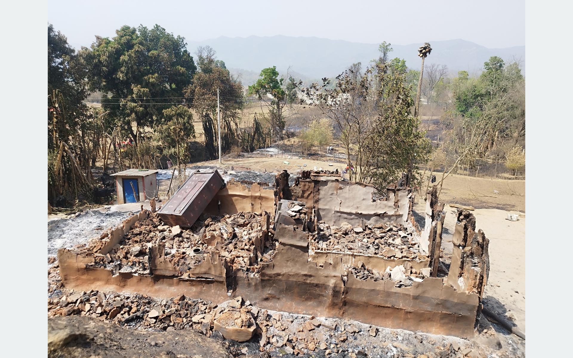 दाङ । २०८१ वैशाख १६ गते बिहान करिब १० बजेतिर घरदेखि पश्चिमतरिको जङ्गलमा आगो लागेको थियो । सोही आगो निभाउन भनेर राजपुर गाउँपालिका–७ हाडबासका खिमलाल खत्री गएका थिए । गाउँले सबै त्यहीँ गएको समयमा छिमेकीको एक घरमा आगोले भेट्यो । त्यही आगोले खत्रीको घर पनि भेट्यो । घरभित्र रहेको सबै अन्नपात जलेर छिनभरमै खरानी भयो । छोराले गाडीको हेबी लाइसेन्स बनाउन भनेको थियो त्यो बुझाउनका लागि एक लाख ऋण गरेर ल्याएको पैसा र घरमा भएको २० हजार पैसा थियो त्यो पनि जल्यो । घरमा भएको अन्नपातदेखि सबै सामग्री खरानी भयो ।