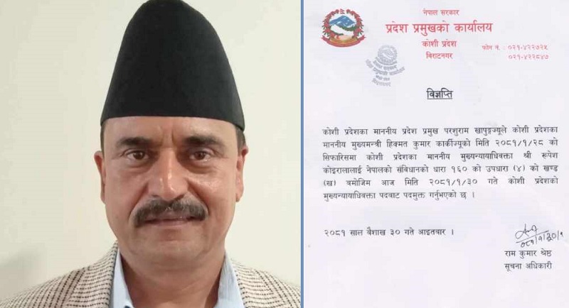प्रदेश प्रमुख परशुराम खापुङले मुख्यमन्त्री हिक्मतकुमार कार्कीको सिफारिसमा कोइरालालाई आइतबार मुख्यन्यायाधिवक्तामा पद मुक्त गरेको प्रदेश प्रमुखको सचिवालयले जानकारी दिएको छ ।