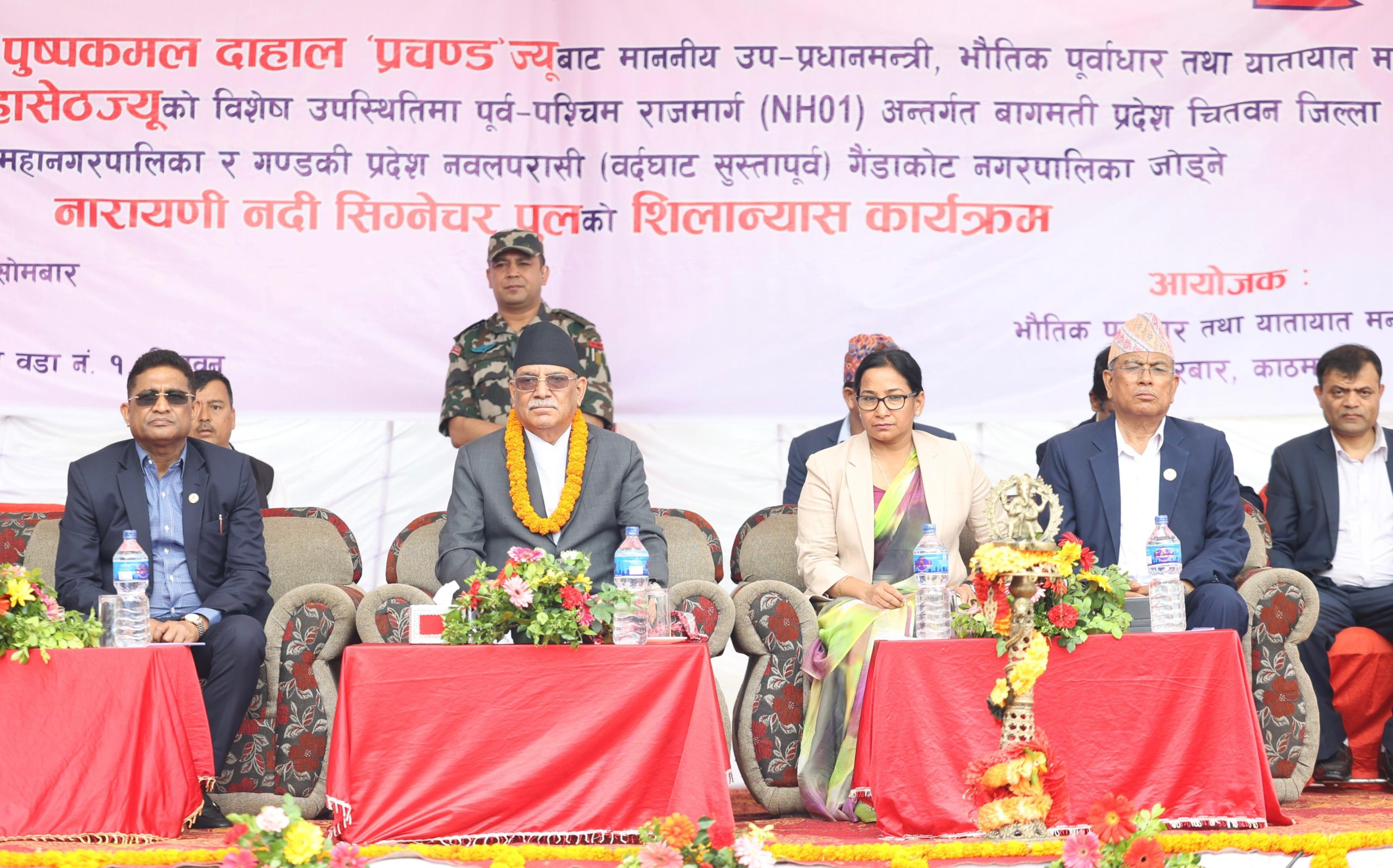नारायणी नदीमाथि निर्माण हुने ‘सिग्नेचर ब्रिज’को आज शिलान्यास गर्दै प्रधानमन्त्री प्रचण्डले रोजगारी र उत्पादनसँग सम्बन्धित भएर एकीकृत आयोजना सञ्चालन गर्ने तयारीका साथ सरकार अगाडि बढेको बताए ।
