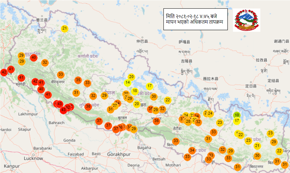 काठमाडौं । मौसम पूर्वानुमान महाशाखाले देशभर तातो लहर चलिरहेकोले सतर्क रहन अपिल गरेको छ । महाशाखाका अनुसार सुदूरपश्चिम र लुम्बिनी प्रदेशका तराई भू-भागका केही स्थानहरूमा बिगत केही दिन देखि अधिकतम तापक्रम ४० डिग्री सेल्सियस वा सो भन्दा बढी मापन गरिएको छ ।