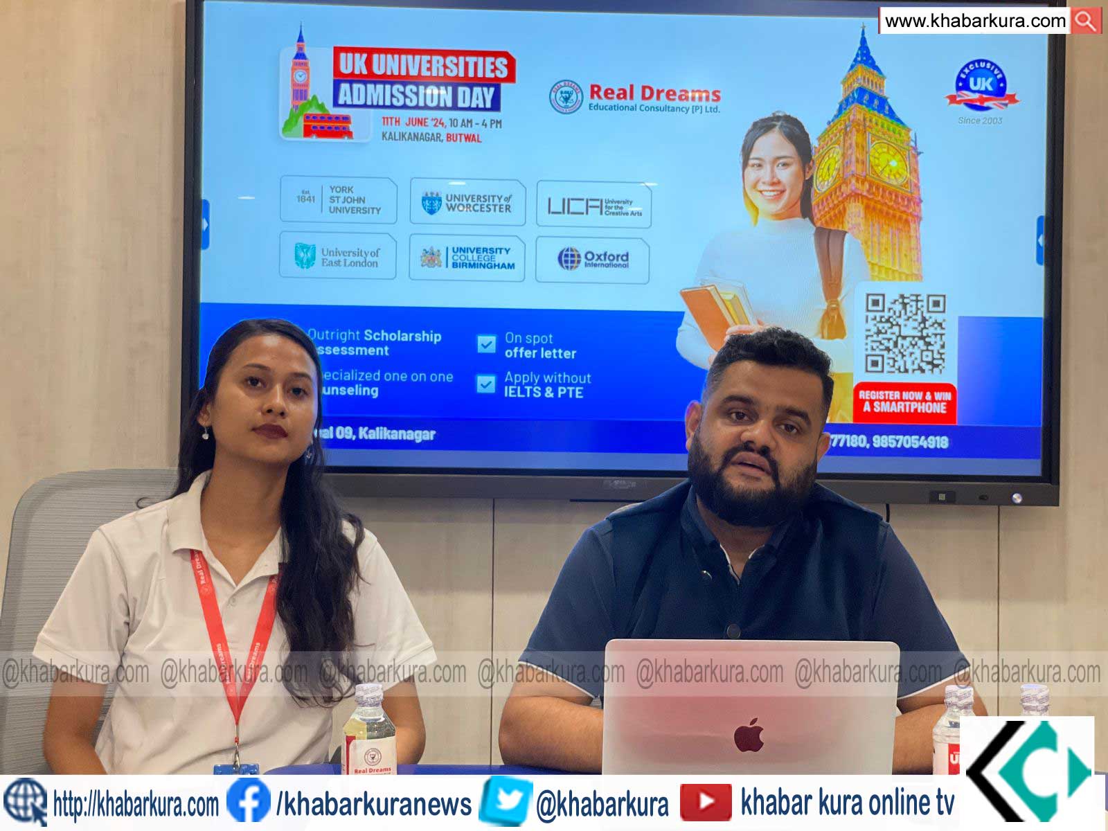 रियल ड्रिम्सले आज काठमाडौंको पुतलीसडकस्थित आफ्नै कार्यालयमा ‘युके युनिभर्सिटी एडमिसन डे’ सम्पन्न गरेको छ भने जु १३ पोखरा र जुन १५ चितवनमा एडमिसन डे हुने जनाएको छ ।
