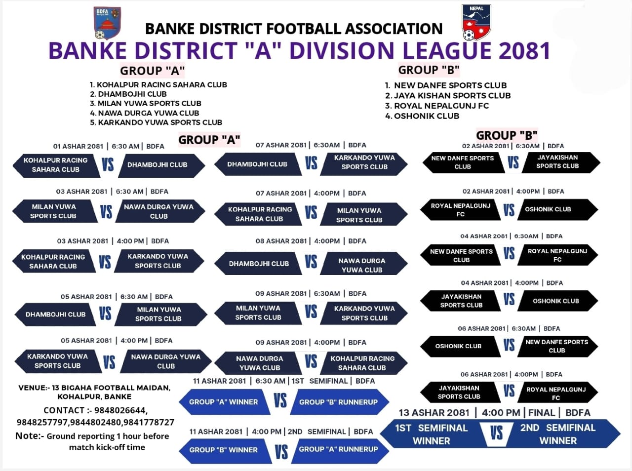 यसैगरी समुह ‘बी’मा न्यु डाँफे स्पोर्टस् क्लब, जय किसान स्पोर्टस् क्लब, रोयल नेपालगन्ज एफसी र ओसोनिक क्लब रहेका छन् ।