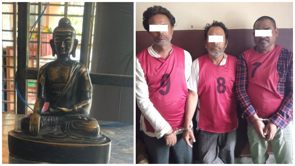 प्रहरीका अनुसार राप्तीसोनारी ८ ढकेरीको सडकखण्डमा शंकास्पद रुपमा हिँडिरहेका उनीहरुमध्य खिमबहादुरले पछाडी बोकेको खैरो रङको झोला खोली हेर्दा ओमनमः शिवायः लेखिएको तुल (रुमाल) मा बेरी लुकाई राखिएको पिँधको गोलाई १ फिट ६ ईन्च , पिध देखि शिरको टुप्पो सम्मको उचाई ९ ईन्च, तौल गर्दा ८ किलो ६८० ग्राम भएको पहेंलो रङ्गको धातुमा अधिकांश भागमा कालो रङको पालिस लगाएको जस्तो देखिने बुद्धको मुर्ति फेला परेको प्रहरीले जनाएको छ । सोही झोलाबाट ८ ईन्च लम्बाई कटर थान १, ८ ईन्च लम्बाई भएको पिलास थान १, ८ ईन्च लम्बाई भएको फलामको रेति थान १, र भारतिय सिमकार्ड १ थान बरामद भएको बाँके प्रहरी प्रवक्ता प्रहरी नायव उपरीक्षक नारायण डाँगीले बताए ।