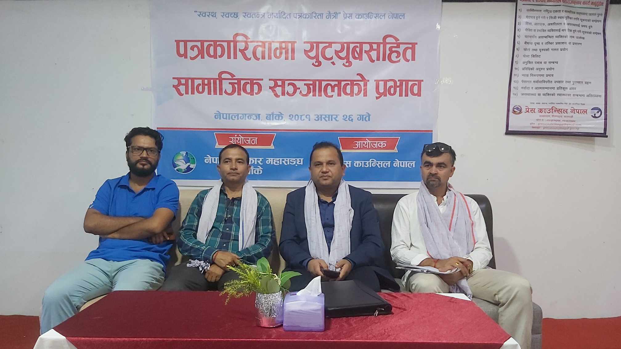 कार्यक्रममा पत्रकार शरद अधिकारी र झलक गैरेले युट्युब, स्थानीय मिडिया र सामाजिक सञ्जालको समाजमा रहेको प्रभावका बारेमा अवधारणा प्रस्तुत गरेका थिए । नेपाल पत्रकार महासंघ बाँके शाखाले संयोजन गरेको कार्यक्रममा शाखाका कार्यबाहक अध्यक्ष संगीन शर्माले स्वागत गरेका थिए ।