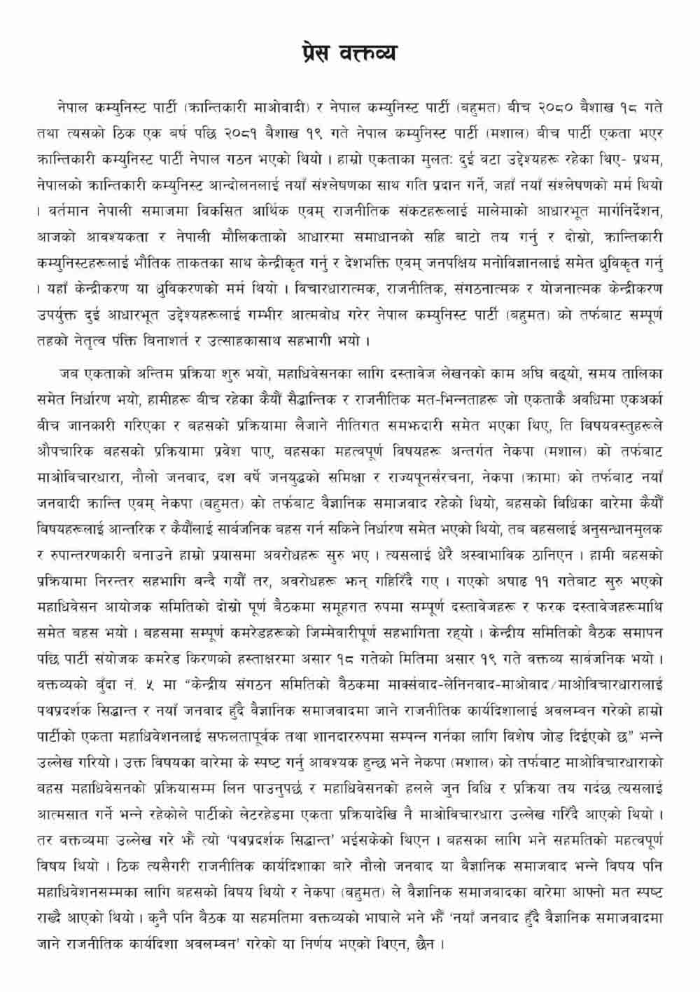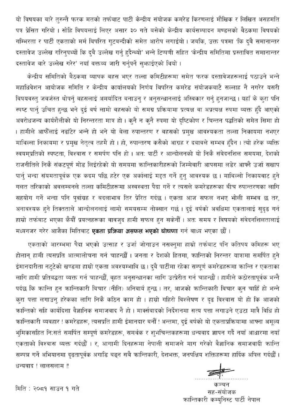 विप्लव नेतृत्वको नेकपाबाट विभाजित भएर बनेको नेकपा बहुमतले वैद्य नेतृत्वको क्रान्तिकारी कम्युनिष्ट पार्टीसँग एकता गरेको थियो । एकतापछि पार्टीको सह-संयोजकको भूमिकामा रहेका धर्मेन्द्र बास्तोला ‘कञ्चन’ ले विज्ञप्ति जारी गर्दै पार्टी एकता