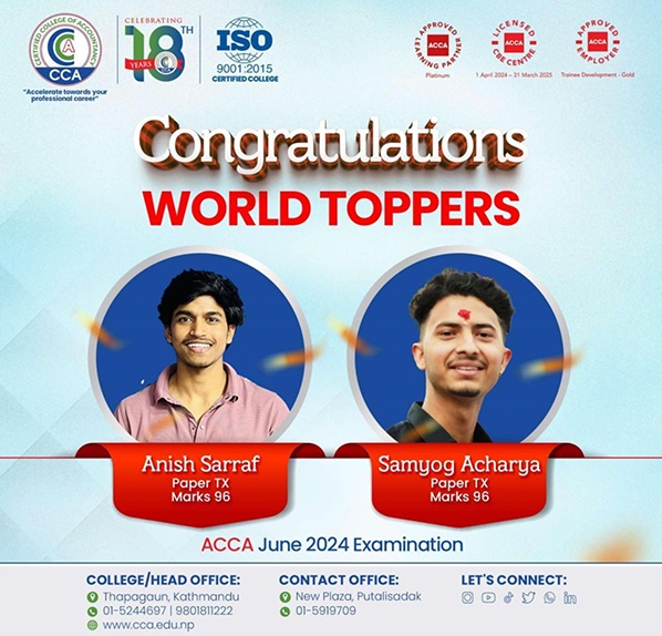 काठमाडौँको थापागाउँस्थित सर्टिफाइड कलेज अफ अकाउन्टेन्सी (सीसीए)मा अध्ययनरत दुवै विद्यार्थीले टी एक्स पेपरमा ९६ अंक ल्याएर ‘वर्ल्ड टपर’ भएका हुन्। यो पेपरको परीक्षामा विश्वभरबाट हजारौँ विद्यार्थी सहभागी थिए।