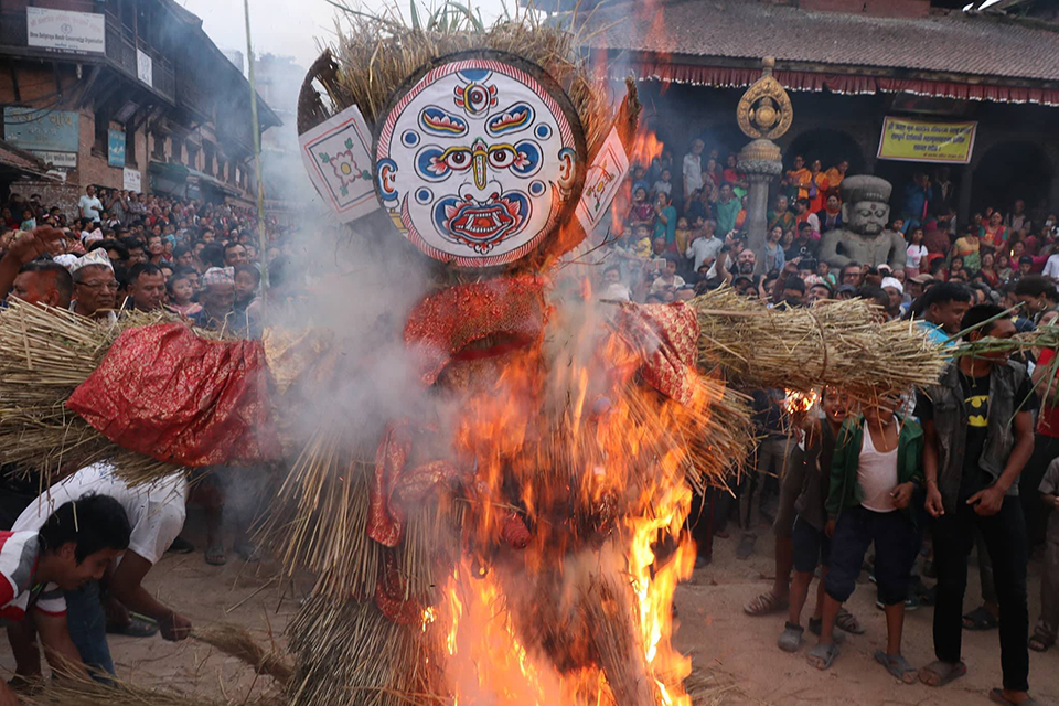 परापूर्वकालदेखि मनाउँदै आएको यस पर्वमा गठामङ्गल नाम गरेको नरभक्षी राक्षस मारिएको सम्झनास्वरूप बिहानै हरियो नर्कट, निगालो अथवा गहुँको छ्वाली मिसाएर तीनखुट्टे राक्षसको स्वरूप बनाई दोबाटो र चौबाटोमा उभ्याइने चलन छ । संस्कृतिविद् तेजेश्वरबाबु ग्वँग छ्वालीबाट बनाई दोबाटो र चौबाटोमा दिनभर राखिने गठामङ्गल बेलुकी भने खेतको बीचमा लगेर बाल्दा धानमा कीरा नलाग्ने विश्वास रहेको बताउँछन । स्थान एवं कुल परम्पराअनुसार कतै भने गठामङ्गललाई खोला वा नदी किनारमा लगी जलाइन्छ ।