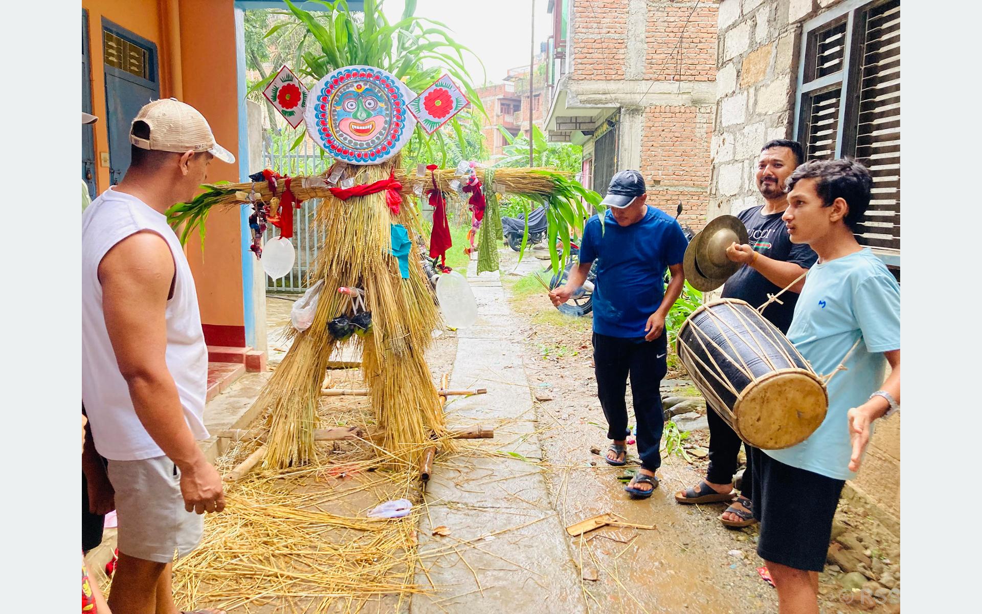परापूर्वकालदेखि मनाउँदै आएको यस पर्वमा गठामङ्गल नाम गरेको नरभक्षी राक्षस मारिएको सम्झना स्वरूप बिहानै हरियो नर्कट, निगालो अथवा गहुँको छ्वाली मिसाएर तीनखुट्टे राक्षसको स्वरूप बनाइ दोबाटो र चौबाटोमा उभ्याइने चलन छ । संस्कृतिविद् तेजेश्वरबाबु ग्वँग छ्वालीबाट बनाइ दोबाटो र चौबाटोमा दिनभर राखिने गठामङ्गल बेलुकी भने खेतको बीचमा लगेर बाल्दा धानमा कीरालगायत रोग नलाग्ने विश्वास रहेको बताउँछन् ।