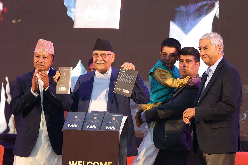 काठमाडौं । प्रधानमन्त्री केपी शर्मा ओलीले क्याप्टेन रामेश्वर थापाको अंग्रेजी पुस्तक ‘इन्टु द फायर’ को विमोचन गरेका छन् ।
