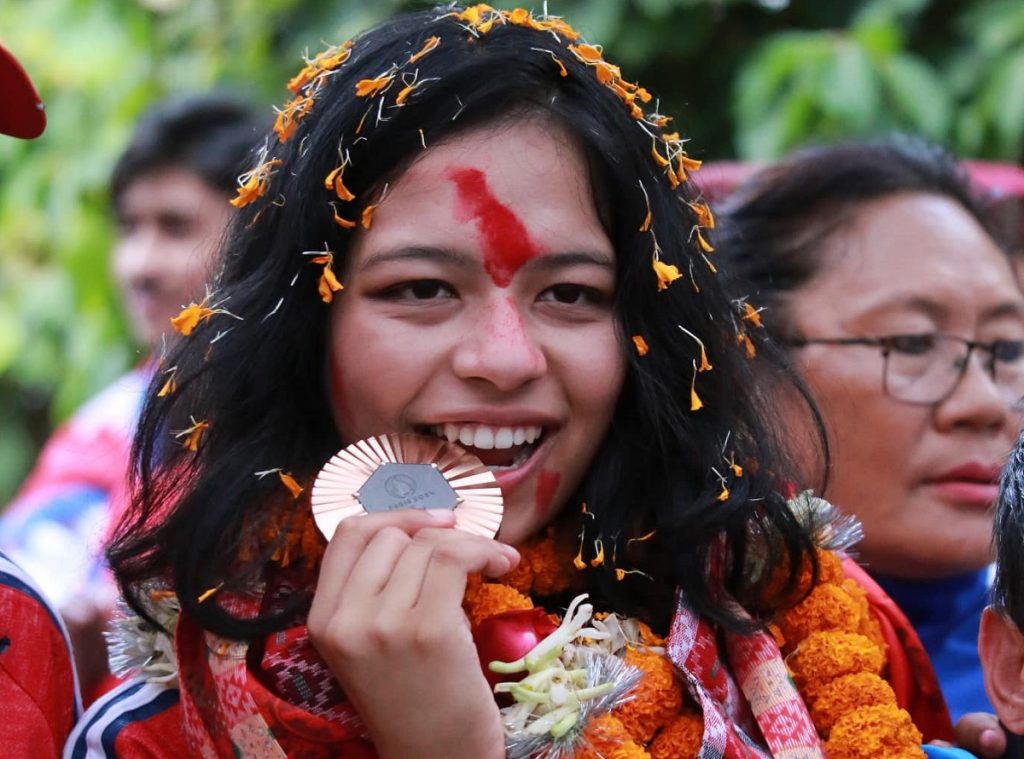 काठमाडौं । फ्रान्सको पेरिसमा रहेको ग्रान्ड प्यालेसमा पलेसा गोबद्र्धन रिङमा भिड्दै गर्दा नेपाली गोलाद्र्धतिर मध्यरात भइसकेको थियो । गत शनिबार बिहानमात्रै संसारभरि छरिएका नेपालीमा एउटा हर्षको सञ्चार भयो-पलेसाले कास्य पदक जितिन् । नेपालको खेल इतिहास अझ भनौँ ओलम्पिक इतिहासमा पलेसाले ल्याएको यो ऐतिहासिक पदक हो । यसअघि यस्ता खेलमा नेपाली खेलाडीले पदकहरू जित्न सकेका छैनन् ।