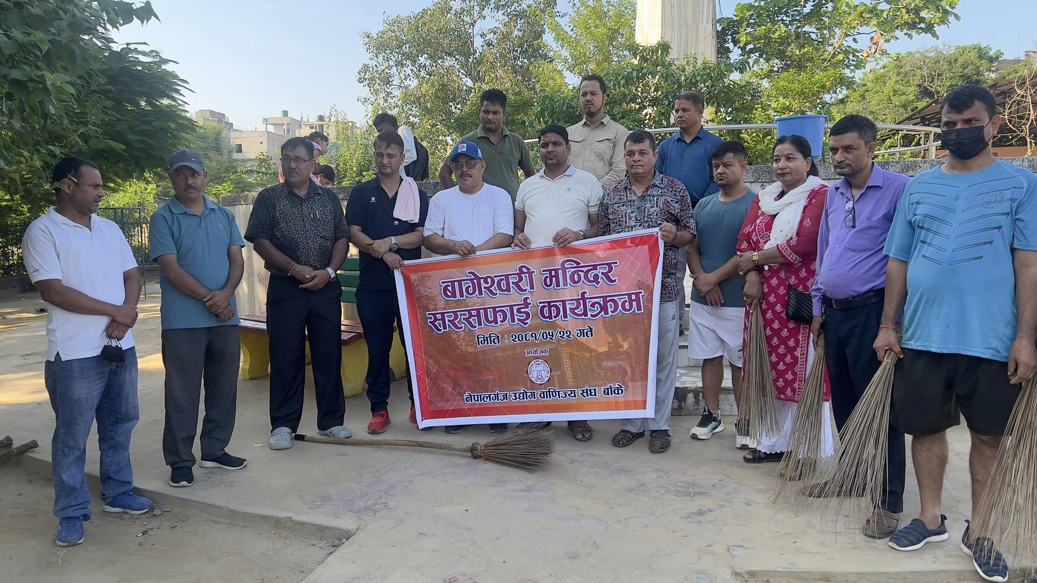 नेपालगन्ज । भक्तजनहरुले फालेको फोहरका कारण दुगन्धित बनेको नेपालगन्जको बागेश्वरी मन्दिर परिषरमा स्थानीय ब्यापारीहरुले सरसफाई गरेका छन् । नेपालगन्ज उद्योग बाणिज्य संघको आह्वानमा मन्दिर परिषरमा ब्यापारीहरुले सरसफाई गरेका हुन् ।