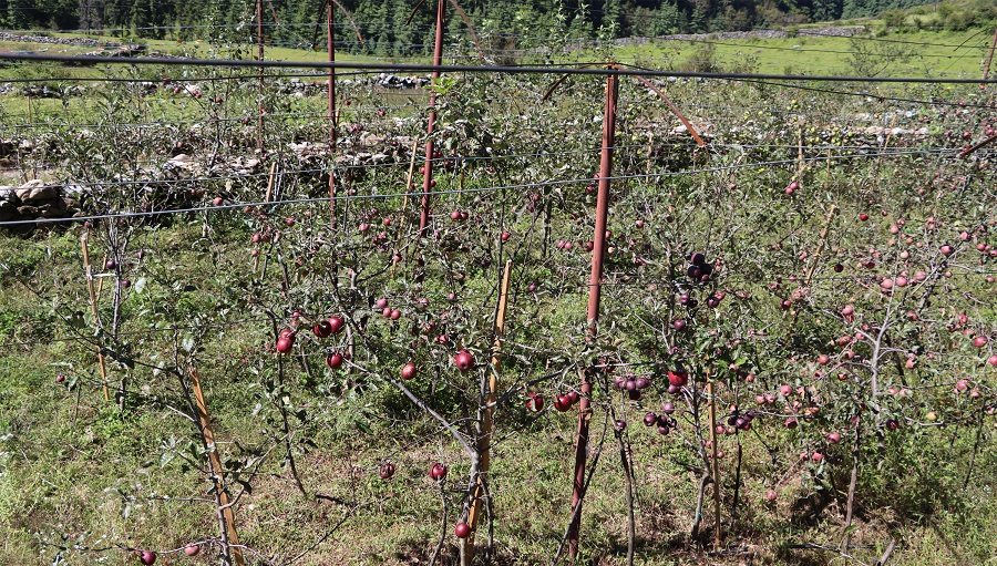 सडकको बायाँपट्टी ठूलो क्षेत्रफलमा लटरम्म फलेका थरिथरी जातका स्याउले भरिएको बगान फलामे तारले घेरिएको छ । वर्षौँअघिदेखि मस गाउँमा रैथाने जातका स्याउखेती गरिँदै आए पनि अपेक्षित उत्पादन हुन नसकेपछि विदेशबाट बिरुवा ल्याएर लगाउन थालिएको हो ।