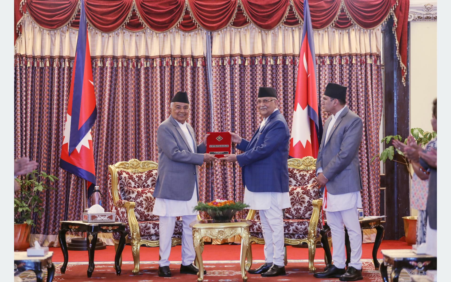 काठमाडौं । राष्ट्रपति रामचन्द्र पौडेलसमक्ष प्रधानमन्त्री केपी शर्मा ओलीले राष्ट्रिय सुरक्षा परिषद्का पछिल्ला दुुई आर्थिक वर्षका वार्षिक प्रतिवेदन पेस गरेका छन् ।