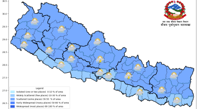 त्यसैगरी आज राति देशभर आंशिकदेखि साधारणतया बदली रहने छभने गण्डकी, लुम्बिनी र सुदूरपश्चिम प्रदेशका केही स्थानमा मेघगर्जन र चट्याङसहित हल्कादेखि मध्यम वर्षाको सम्भावना छ । कोशी, गण्डकी, लुम्बिनी र सुदूरपश्चिम प्रदेशका एक-दुई स्थानमा भारी वर्षाको पनि सम्भावना रहेको छ ।