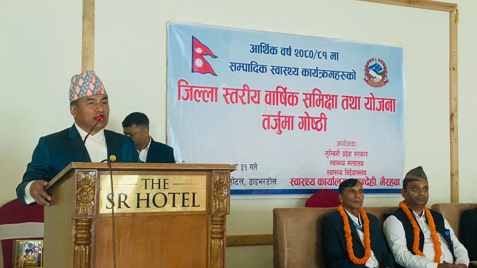 स्वाथ्य कार्यालय रुपन्देहीको आयोजनामा आर्थिक वर्ष २०८०्०८१ मा सम्पादित जिल्ला स्तरिय वार्षिक समिक्षा कार्यक्रमलाई तिलोत्तमा ड्राईभर टोलमा सम्बोधन गर्दै मन्त्री सारुले स्वाथ्य क्षेत्र सबैभन्दा गम्भिर र संवेदनशिल भएको भन्दै यसमा सबै निकाय सचेतनापुर्वक सजग भएर योजनाबद्ध रुपमा लाग्नुपर्ने मन्त्रीले बताए । ‘प्रदेशमा मातृ मृत्युदर, मानसिक रोग लगायतका नसर्ने रोग समस्याको रुपमा अगाडी बढेको छ, यसलाई न्युनिकरण गर्नको लागि सबै निकाय गम्भिरतापूर्वक लाग्नुपर्छ’उहाँले भन्नुभयो,‘हामी सरकारले के कस्तो सहयोग, सहजीकरण गर्नुपर्ने हो तयार छौं ।’
