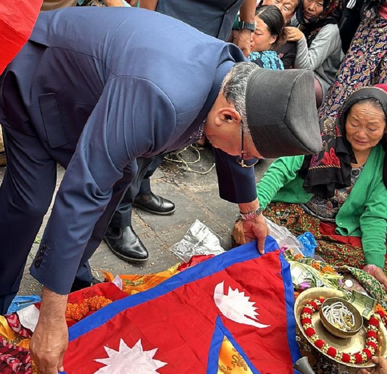पूर्वप्रधानमन्त्री एवं नेकपा माओवादी केन्द्रका अध्यक्ष पुष्पकमल दाहाल ‘प्रचण्ड’ले राष्ट्रिय झण्डा र पार्टीको झण्डा ओढाएर अन्तिम श्रद्धाञ्जली दिए ।