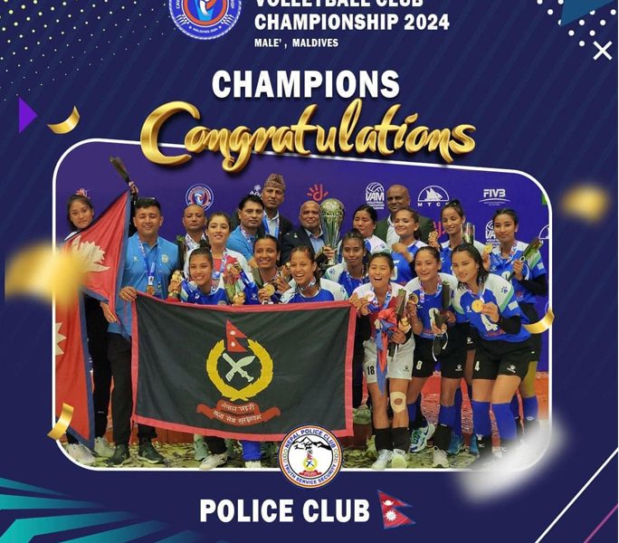 काठमाडौं । नेपाल पुलिस क्लब माल्दिभ्समा सम्पन्न काभा महिला भलिबल क्लब च्याम्पियनसिपमा च्याम्पियन बनेको छ । माल्दिभ्सको मालेमा शनिवार उज्वेकिस्तानको हुमो भिसी लाई ३-० को सोझो सेटमा हराउँदै पुलिस च्याम्पियन बनेको हो । पुलिस अपराजित रहँदै च्याम्पियन बन्न सफल रह्यो ।