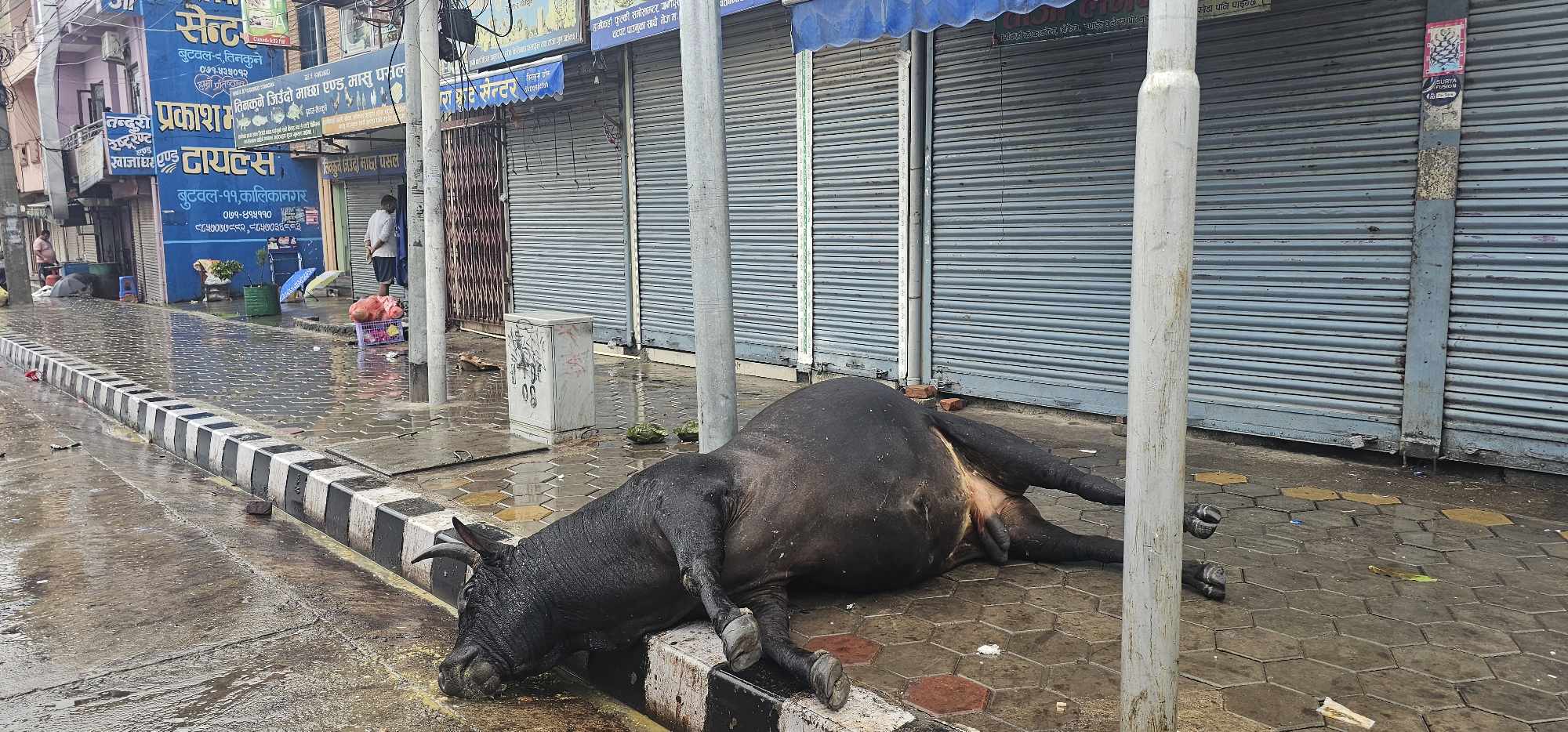 बुटवलको तिनकुनेस्थित फुटपाथमा रहेको सडकबत्तीको पोलमा करेन्ट लागेर साँढेको मृत्यु