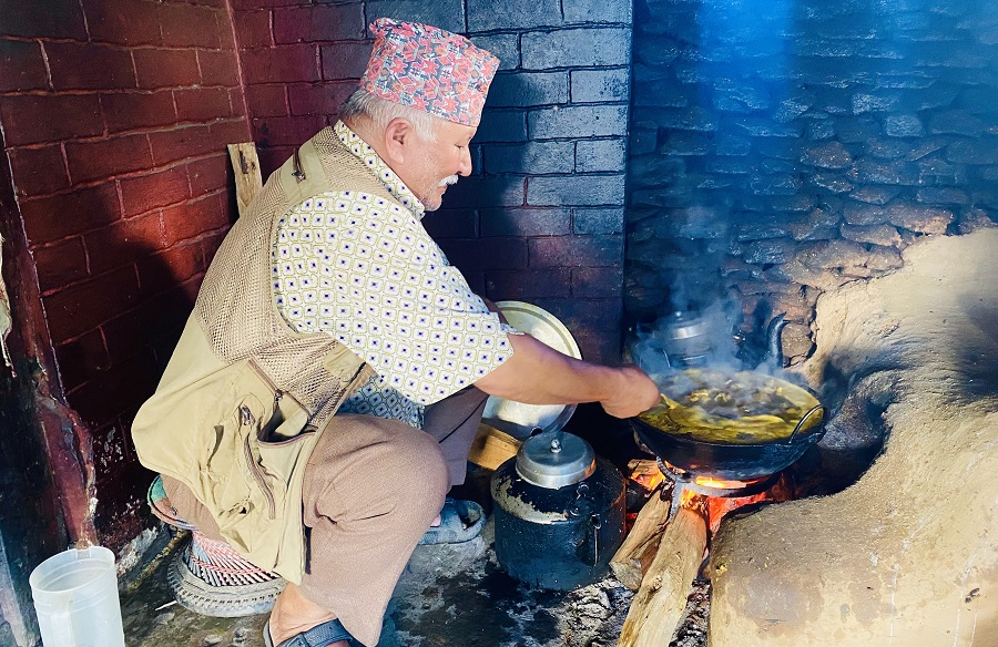 फलामको कराइमा रैथाने बोकाको पाकिरहेको मासु विस्तारै चलाउँदै भण्डारीले सुनाए, “यो चुलोमा खाना पकाउन लागेको २० वर्ष भयो, सबै खानेकुरा दाउराको आगोमा पकाउँछौँ ।”