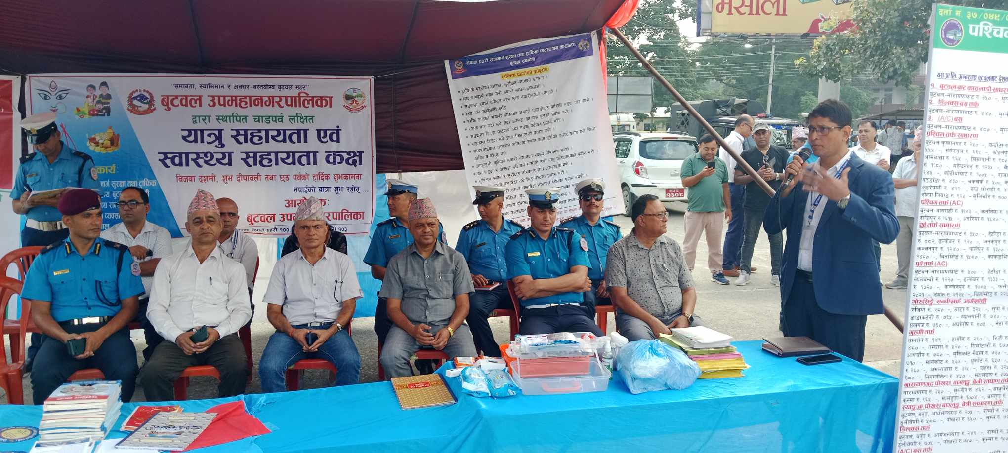बुटवल उपमहानगरपालिकाले बिभिन्न सरोकारवाला निकाय र संघसंस्थाहरुको सहकार्यमा बुटवलको बसपार्कमा यात्रु तथा स्वास्थ्य सहायता कक्ष स्थापना गरिएको जनस्वास्थ्य शाखा प्रमुख युवराज पाण्डेले बताए । भिडभाडका कारण यात्रुहरुलाई पर्ने समस्या, गन्तब्य र सवारी साधनको बारेमा जानकारी, चोरीचकारी लुटपाट लगाएत बिभिन्न प्रकारका असुरक्षा, आकस्मिक रुपमा उत्पन्न हुने शारिरिक स्वास्थ्य समस्या लगाएतका ब्यक्तिगत घटनाका बारेमा समेत सहयोग गर्ने उद्देश्यले हेल्प डेस्क राखिएको शाखा प्रमुख पाण्डेले बताएका छन् ।